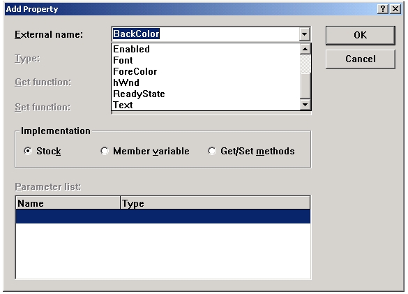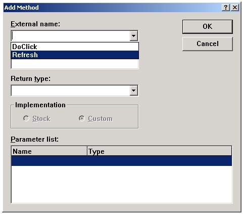 对ActiveX控件属性、方法和事件的添加均有库存和自定义两种。其中对属性和方法的添加在MFC ClassWizard对话框的Automation页中通过按钮"Add Property…"和"Add Method…"弹出如图5和图6所示的添加属性和添加方法的对话框来完成。对于库存属性和方法,可以直接从External name组合框的下拉列表中选取,Implementation项将自动设置为Stock。对于自定义属性和方法的添加与在自动化对象中为接口添加属性和方法的过程一样,ClassWizard将在.odl文件和控件类生成相应的代码,下面给出的是在控件类中实现的部分分发映射代码: