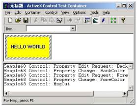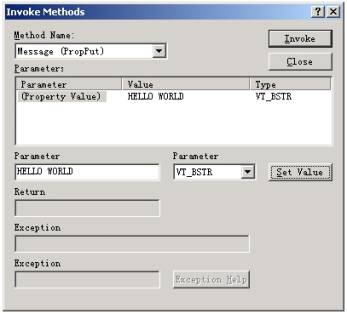 可以编译程序并在ActiveX Control Test Container工具中对其进行测试。在插入控件后,通过"Invoke Methods…"菜单项弹出如图7所示的对话框。在Method Name组合框中可以选择要测试的属性和方法。其中,对于属性的测试分别有ProgGet和ProgSet的说明以指出是对属性值的获取与设置。在Parameter编辑框中输入要设置的参数及其对应的参数类型,点击SetValue按钮将把该参数值添加到参数列表框,最后点击Invoke按钮将在控件应用设置的属性并执行指定的方法。对于有返回值的方法,其执行结果将在Return编辑框中显示。如果出现了异常操作,在Exception编辑框中将会显示出相应的异常错误信息。图8给出了经过属性设置的控件界面。