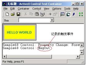 在用ActiveX Control Test Container对刚添加的事件进行测试时,首先通过"Control"菜单下的"Logging…"菜单项弹出如图10所示的对话框,并从"Events"属性页中选中要跟踪记录的事件。当通过Invoke Methods对话框设置Message属性的内容超过10个字符后,位于程序框架下方的分割视图将记录控件所触发的MsgOut事件(如图11所示)。