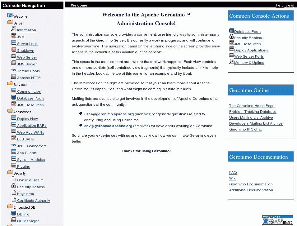 对Geronimo 2来说,进行配置及部署Java应用程序非常的简单,特别是通过它提供的Web控制台更加简单。Geronimo控制提供了许多简单的功能来帮助开发人员进行应用程序的配置。可以进行数据库的连接池测试及安全设置或配置等。