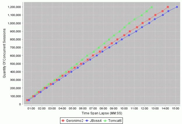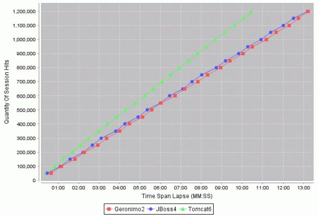 JBoss 4.2的表现不如Geronimo2,毕竟Geronimo 2所采用的实现技术及思想都是最新的。正如图所示,Tomcat 6的性能最好,因为Tomcat 6本身就是为JSP/servlet量身定做的Java EE 5应用服务器。相比起JBoos或Geronimo需要20秒进行启动的长时间,Tomcat仅仅需要3秒钟。