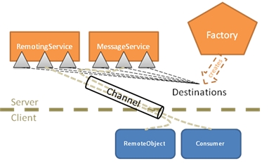 Flex中最重要的通信基础设施是Destinations。 Destination是通信信道的服务器端终点。一个服务提供一个 Destination,而客户组件则通过这个Destination与这个服务相关联。关联的客户组件可以向Destination发送和读取消息。 Destinations可以由Factories创建。