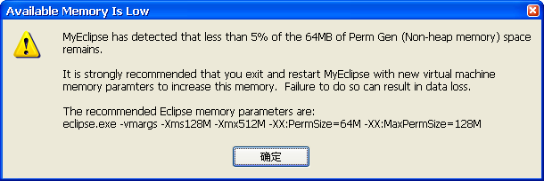 MyEclipse内存不足之JVM内存浅谈如果没有进行设置的话,在使用MyEclipse的经常出现如下图所示内存不足的提示。