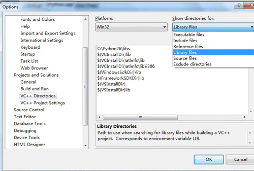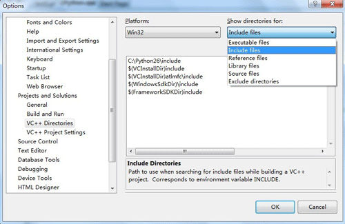 2)设定vs2008 引入python头文件: tools->options->projects and solutions->