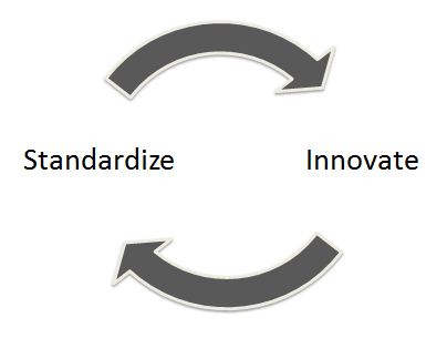 但是就整个产业的进步而言,标准只是整个故事的一部分。各家厂商与组织可以广泛地依照标准实作出技术,像是铺设好的道路一般,引导整个业界往共同的方向迈进。但在康庄大道出现之前,必须有人先尝试走出一条小径,这就是创新。创新和标准往往是共生的,创新走在其他标准之前,使得日后建立标准时无须针对每个遇到的问题去“重新发明轮子”,寻求解决的方法。创新能够专注处理特定待解决的问题,创新也可补足或扩展现有的标准,最终成为被广泛接受的标准,羊肠小径扩展为康庄大道。