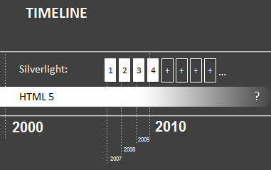 在HTML 5 规格制定过程的一半时间之中,微软公司已经释出了四个主要的Silverlight 版本。目前还不清楚何时HTML 5 规格与相关测试套件会完成。对于HTML 5 中的各项新功能,目前应该关注的,是已经稳定下来所有的浏览器都支持的规格。支持HTML 5 浏览器若要达到高普及率,需要超过十亿用户安装最新版本浏览器,或是购买新设备与新机器,这将需要一段时间方能普及。当HTML 5 到达能被广为接受的时间点时,同时Silverlight 已经演进出新的重要功能。Silverlight 现在就可以应用于所有流行的浏览器与作业系统。
