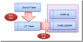 CDC仅仅会将基于某个表的数据改变记录到基于该表的CT表中,最终我们需要将这些CT表中的数据转存到我们指定的AuditLogData表中,这个工作可以通过SQLJob来实现。你自行创建一个SQL Job实现从若干CT表到AuditLogData的数据转存,并根据你的需要(主要是实时性的需要)配制Job执行的时间或者间隔下图揭示了AuditLog详细信息是如何一步步地被记录的。
