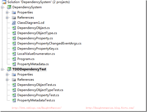 通过上面的例子可以看出,我们一般.NET属性是直接对类的一个私有属性进行封装,所以读取值的时候,也就是直接读取这个字段;而依赖属性则是通过调用继承自DependencyObject的GetValue()和SetValue来进行操作,它实际存储在DependencyProperty的一个IDictionary的键-值配对字典中,所以一条记录中的键(Key)就是该属性的HashCode值,而值(Value)则是我们注册的DependencyProperty。 回顾了一些基础知识,那我们下面就开始今天的依赖属性系统TDD之旅。