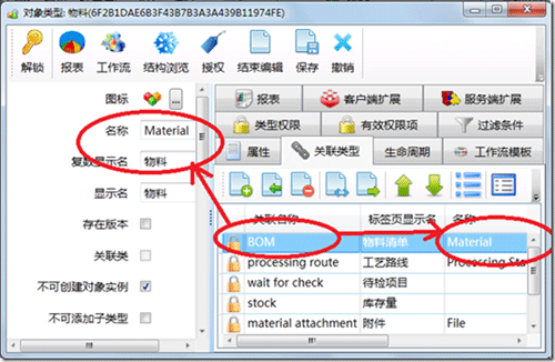 在系统中创建“物料”对象类型,左边可以指定对象类型的基本属性,右边有一系列标签页,可以定义类的属性,类的关联等内容。创建一个类,系统会自动生成一些基本属性,如ID,创建人,创建时间,修改人,修改时间等。在属性标签页可以添加物料的自定义属性,如物料的“编码”、“名称”等。在数据库中将自动按模型生成表Material,用来存储“物料”对象类型的实例数据。