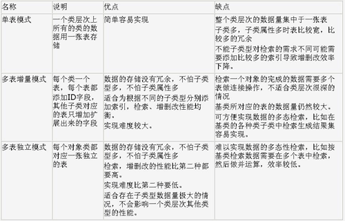 关系型数据库不支持继承关系,解决继承关系的对象类的数据的存储一般有三种模式,分别是“单表模式”、“多表增量模式”、“多表独立模式”。几种模式比较如下: