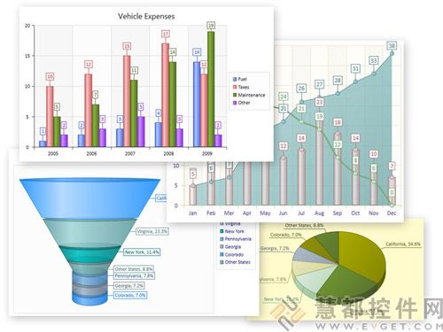 该图表控件提供了多种不同的图表类型:Line,Area,Bar and Column,Pie,Pyramid,Funnel等等。