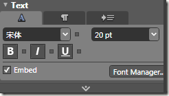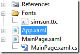 选中一种字体之后,勾选字体面板下面的Embed复选框即可将指定字体打包到Silverlight工程中去。这个时候工程中自动生成了Fonts文件夹,里面放置了宋体这个字体文件。
