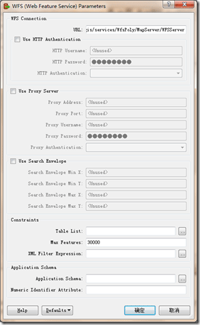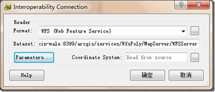 ArcGIS中对WFS访问客户端的支持是基于FME来实现的,所以新建WFS连接的界面的风格与FME基本一致,如下图所示:
