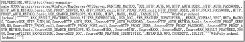 当使用Interoperability模块新建了一个WFS连接后,ArcGIS会在目录"%userprofile%\AppData\Roaming\Safe Software\Interoperability"中自动生成一个后缀为".fdl"的WFS连接文件。将该文件使用文本编辑器打开,可以发现该文件其实就是存储了所有用于定义该WFS连接的相关参数: