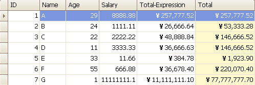 在上图中,ID、Name、Age、Salary是数据库中已有的字段,而Total—Expression和Total是绑定的非绑定列。在这里我想介绍XtraGrid中绑定非绑定列的两个方法:使用XtraGrid里面的表达式方法和使用CustomUnboundColumnData事件的方法!