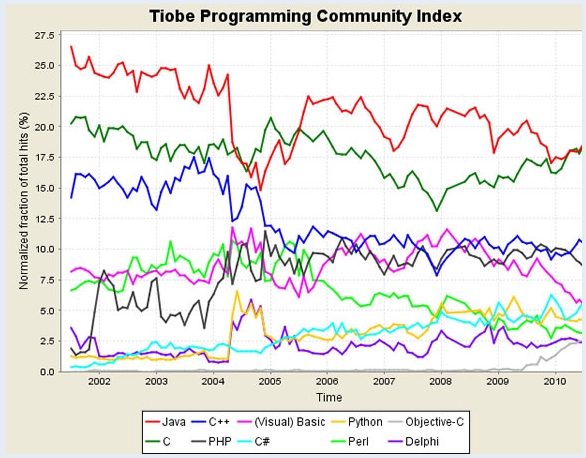 概述:2010年8月TIOBE发布了新一期的编程语言排行榜,我们看到前5名的位置还没有变化,关键是第6名的C#与之后的Python互相调换了位置,本文将带领大家一起来看看新一期的编程语言排行榜的变化趋势。