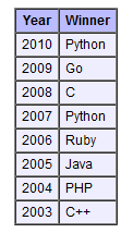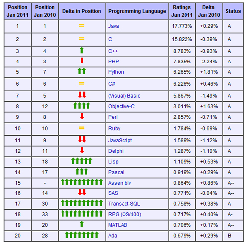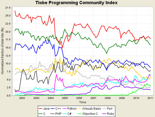 概述:Tiobe发布了2011年度的第一期编程语言排行榜,在本期榜单中前五名是Java、C、C++、PHP和Python。出人意料的是Python超越了C#排到了第五名,它也以2010年增速1.81%的成绩压倒Object-C成为2010年度编程语言。