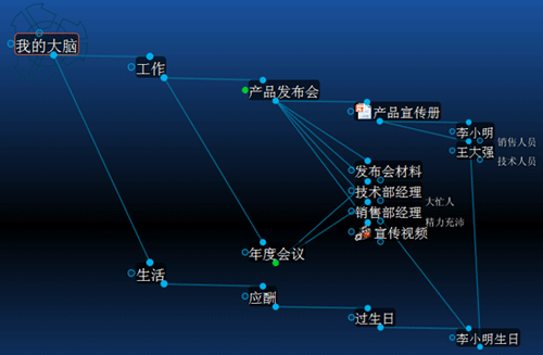 PersonalBrain则采用了立体网络的表现形式,与MindManager最大的不同之处在于,MindManager面对的是由思维而导致的行动,就是各种各样的任务,并将他们清晰的表示出来;而PersonalBrain则直面其本质:思维,它能够将你所有看到的,想到的,需要记录的,需要回忆的东西,全部放到软件中去,并且建立他们各自之间的联系,由此来形成一个庞大的网络。相比之下,PersonalBrain更像是你的“电子大脑”,使用PersonalBrain可以展示的是你的大脑中的一切信息,以及他们的联系。当你灵感突发,想到了某个东西,却又无法想起到底有多少事物与它相关的话,的作用会非常明显。只要在“电子大脑”中搜索它并点击,所有相关的内容一幕了然。