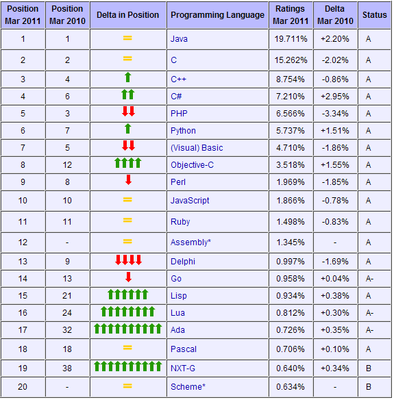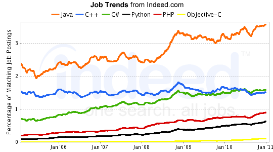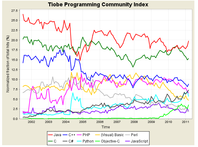 概述:TIOBE刚刚公布了2011年3月编程语言排行榜。与上月相比,本月排名中最引人注目的是C#连升两级,超过了PHP和Python,第一次排名第四,而且市场占有率也逐渐逼近C++。它也是近年来前十语言中一直保持上升趋势的。美国职位搜索网站Indeed的趋势也印证了这一点,C#目前的职位已经超过C++。