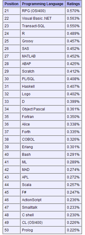 大家都非常关注的Java平台上的语言中,Groovy排名最高,Scala其次(但低于Erlang和Haskell、D),其他的未进榜。