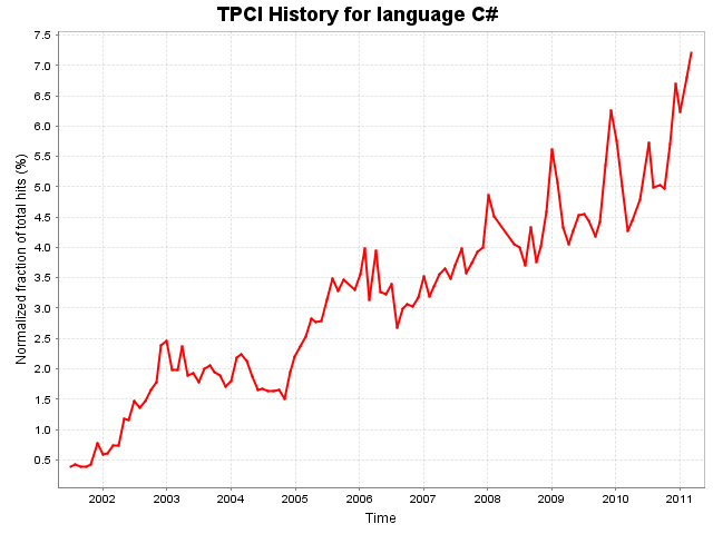 TIOBE刚刚公布了2011年3月编程语言排行榜。与上月相比,本月排名中最引人注目的是C#连升两级,超过了PHP和Python,第一次排名第四,而且市场占有率也逐渐逼近C++。它也是近年来前十语言中一直保持上升趋势的。美国职位搜索网站Indeed的趋势也印证了这一点,C#目前的职位已经超过C++。