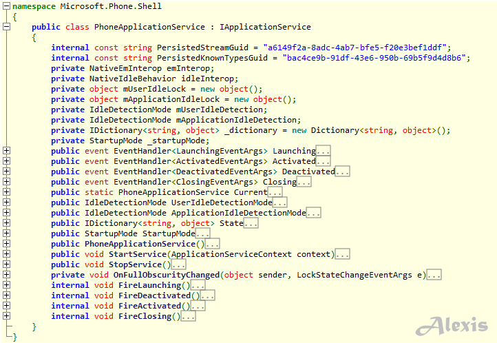 The PhoneApplicationService class provides access to various aspects of the application’s lifetime. This includes management of the application’s idle behavior and management of the application’s state when it becomes active or inactive.