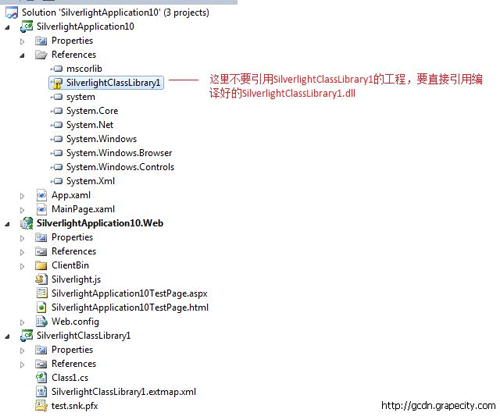 3. SilverlightApplication10 不要引用SilverlightClassLibrary1的工程,要直接引用编译好的SilverlightClassLibrary1.dll
