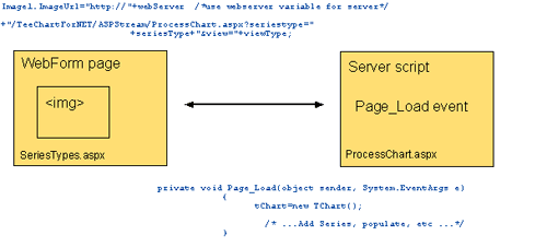 客户端浏览器页面(SeriesTypes.aspx)包含一个图像,其IMG连接是aspx服务器脚本(ShowSeries.aspx)。客户端页面上的提交按钮调用含有ServerChart处理的参数化变量的服务器脚本。该按钮发送变量来作为设置客户端页面上图表图像的imageURL的参数的一部分,因此,返回一个基于已处理的参数的动态图表。