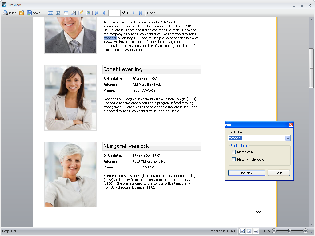 FastReport.NET提供方便的MS Word样式的预览窗口,支持在报表预览状态中进行文本搜索,还支持在报表预览状态中进行修改。