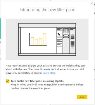 在7月版中,宣布了新过滤器窗格的一般可用性,现在可以将当前报告转换到新窗格的过程。显然,微软希望以对您当前报告影响最小的方式执行此操作。考虑到这一点,8月,当您第一次打开Power BI Desktop时,将显示一个过滤器窗格自动更新对话框。您一定要利用这次机会,因为微软最终将自动更新所有现有的报告到新的过滤器窗格。
