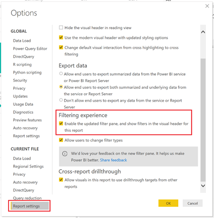通过此对话框,您可以选择使用新的过滤器窗格体验。完成此操作后,只要您打开旧报告,它就会自动显示新的过滤器窗格。现在,如果在打开报告后保存报告,新窗格将保持不变,再次发布报告后,它将向最终用户显示。如果您尚未准备好升级特定报告,则可以通过options对话框中的报告级别设置关闭新窗格。