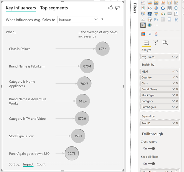 现在,您可以在关键影响因素视觉的分析桶中使用度量。默认情况下,我们将根据您在Explain by bucket中包含的字段来评估度量。现场井中还有一个新的扩展桶,可用于优化分析桶中的度量评估的级别。例如,如果您希望对所有数据进行评估,则可以向Expand by bucket添加ID字段。