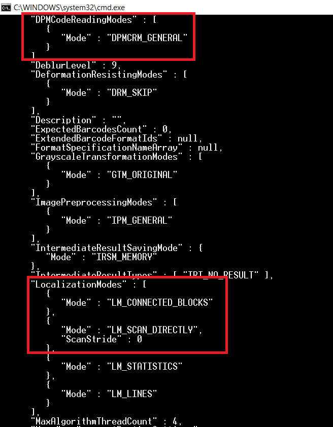 Dynamsoft Barcode Reader SDK支持输入json格式的参数模板。我们可以先查看默认参数,找到相关属性: