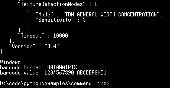 <font style="vertical-align: inherit;"><font style="vertical-align: inherit;">从dbr导入DynamsoftBarcodeReader</font></font><font></font><font style="vertical-align: inherit;"><font style="vertical-align: inherit;"> dbr = DynamsoftBarcodeReader()</font></font><font></font><font style="vertical-align: inherit;"><font style="vertical-align: inherit;"> dbr.initLicense('LICENSE-KEY')</font></font><font></font><font style="vertical-align: inherit;"><font style="vertical-align: inherit;"> 结果= dbr.decodeFile(fileName,dbr.BF_ALL)</font></font><font></font><font style="vertical-align: inherit;"><font style="vertical-align: inherit;"> 结果:</font></font><font></font><font style="vertical-align: inherit;"><font style="vertical-align: inherit;"> 打印(“条形码格式:'+结果[0])</font></font><font></font><font style="vertical-align: inherit;"><font style="vertical-align: inherit;"> print('条形码值:'+结果[1])</font></font><font></font>