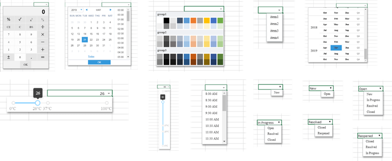 除了选择框和单选列表,在SpreadJS v13.0 中,还新增了多种下拉列表单元格类型:‘colorpicker’|'calendar'|'time'|'calculator'|'month'|'list'|'slider'|'workflow'(颜色拾取器、日程表、时间、日历、月份、列表、切片器、工作流等)。