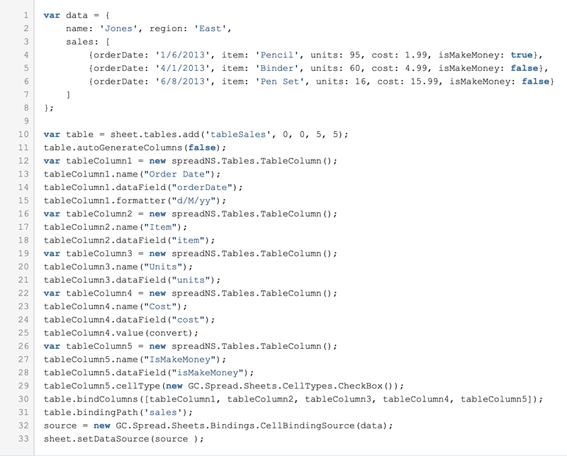 SpreadJS v13.0的表格数据绑定将支持更多列属性字段,这样做的好处是:用户在进行表格数据绑定时,更获得比此前更丰富的属性支持,如格式化、单元格类型、值(值转换函数)等。