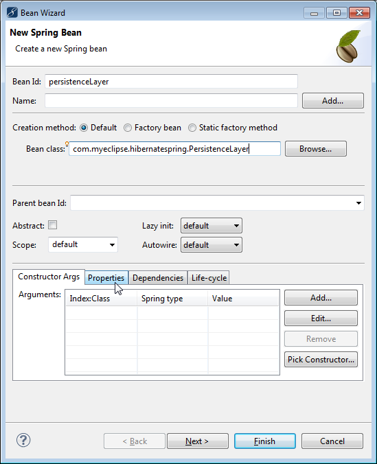 输入持久层的Bean的标识字段,然后输入在Bean类字段中的com.myeclipse.hibernatespring.PersistenceLayer。