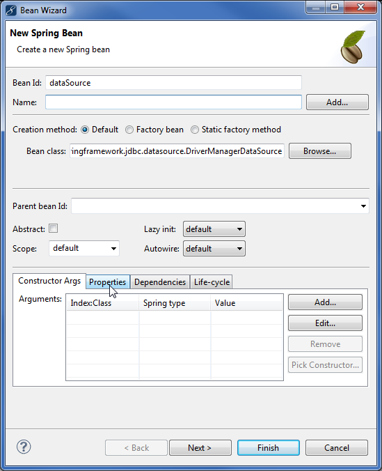 在“Bean Id”字段中输入dataSource,并在“Bean class”字段中输入org.springframework.jdbc.datasource.DriverManagerDataSource。