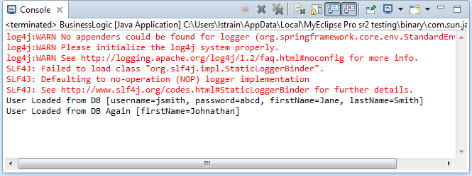 右键单击BusinessLogic.java,选择 Run As>Java Application。Console视图将显示结果。