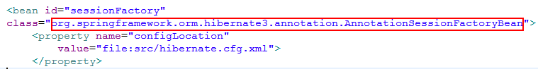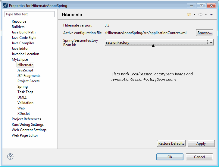 当您选择Spring bean配置文件时,使用上述过程的项目设置中的Hibernate项目属性页会在SessionFactory Bean ID下拉列表中同时列出LocalSessionFactoryBean bean和AnnotationSessionFactoryBean bean。