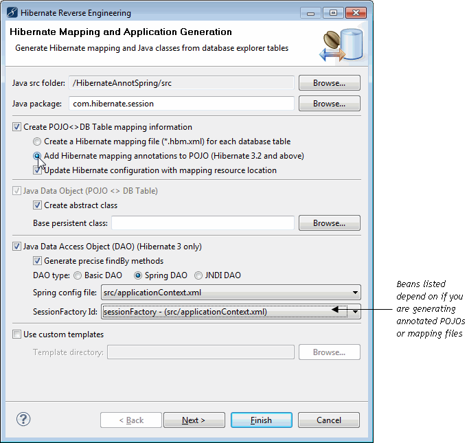 为Spring DAO提供的会话工厂bean Ids取决于您是否选择生成带注释的POJO或Hibernate映射文件。如果选择生成带注释的POJO,那么SessionFactory Id下拉列表中将仅显示AnnotationSessionFactoryBeans,否则将同时列出LocalSessionFactoryBean bean和AnnotationSessionFactoryBean bean。