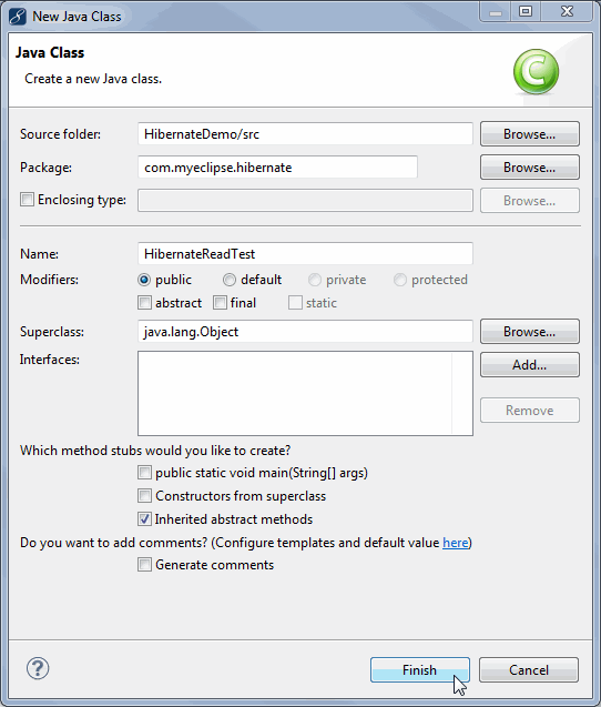 测试Hibernate持久性的一种方法是使用main方法创建Java类。测试类使用Java对象和由Hibernate向导创建的HibernateSessionFactory。查看在HibernateSession类中定义的两个重要方法,如下所示,它们在测试代码中使用。