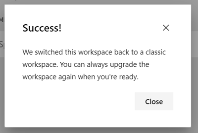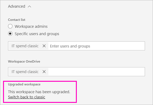 作为工作区升级体验的一部分,你可以选择在升级后的30天内退回到经典工作区。此功能会还原工作区内容与原始Office 365 Group的关联。如果组织在使用新工作区方面遇到了重大问题,可以使用此功能,但存在一些限制。