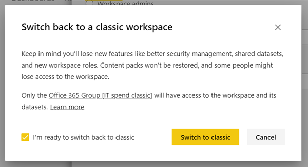 概述:在Power BI中将经典工作区升级到新工作区后30天内可选择退回到经典工作区,建议在退回之前先阅读本文中有关切换回经典工作区的注意事项。