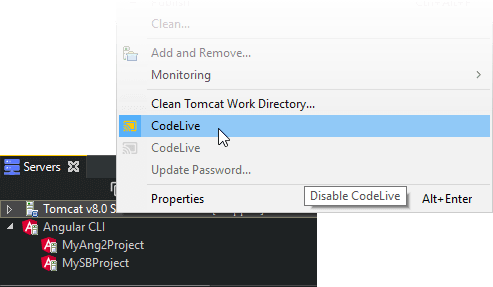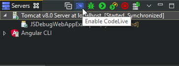 在“Sever”视图中右键单击Java EE服务器,然后选择CodeLive(此菜单选项用作切换)可打开或关闭CodeLive。启用CodeLive时,该图标突出显示。