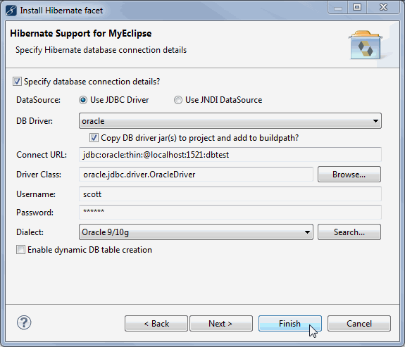 从“Dialect”下拉列表中,为数据库选择适当的Hibernate方言。