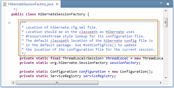 下图突出显示了新创建的HibernateSessionFactory.java文件的重要功能。此类管理单个Hibernate Session对象,该对象由该getSession()方法延迟初始化,并由该方法刷新和释放closeSession()。在运行时,Hibernate会话创建过程必须能够在类路径上找到hibernate.cfg.xml文件。