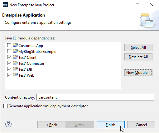 选择Test1Web项目并单击Finish。如果列表为空,则没有可以与该EAR项目关联的现有项目。