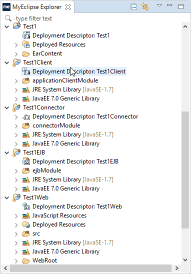 完成向导后,将创建并配置五个MyEclipse项目:Test1、Test1Client、Test1Connector、Test1EJB和Test1Web。