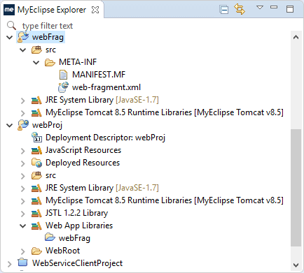下载webfragment.zip,将现有项目导入MyEclipse。您将有两个项目——WebFragmentHost和WebFragment。